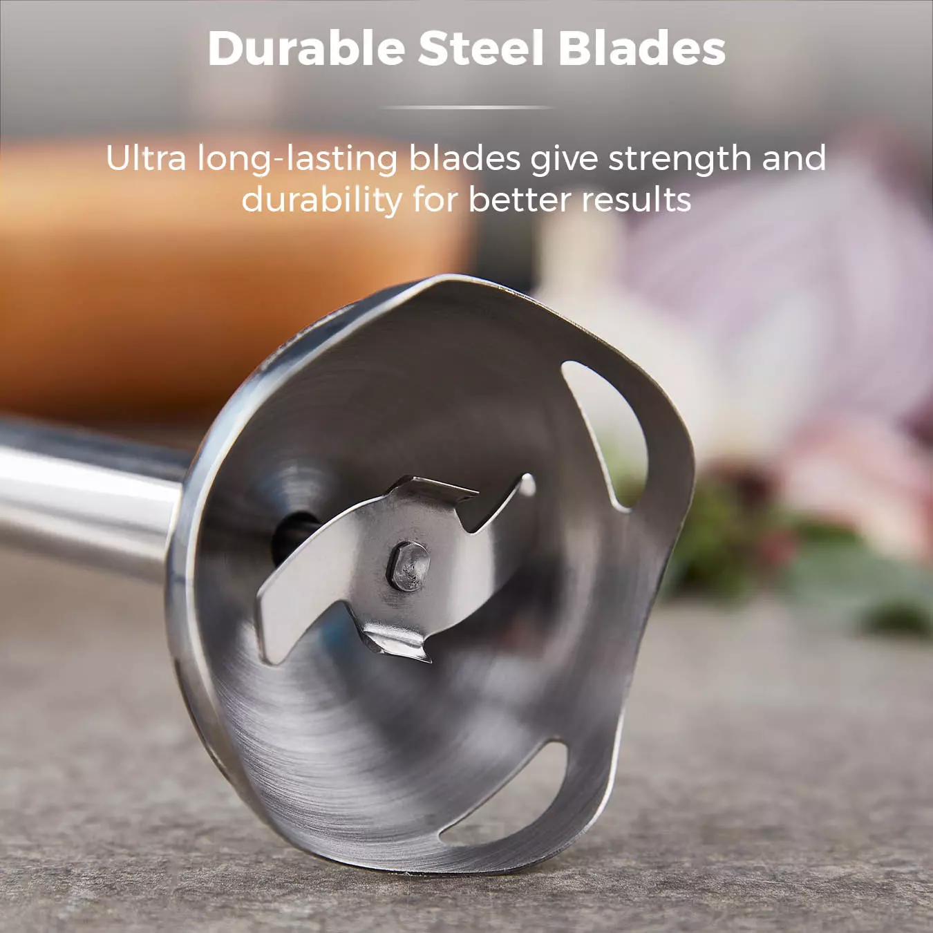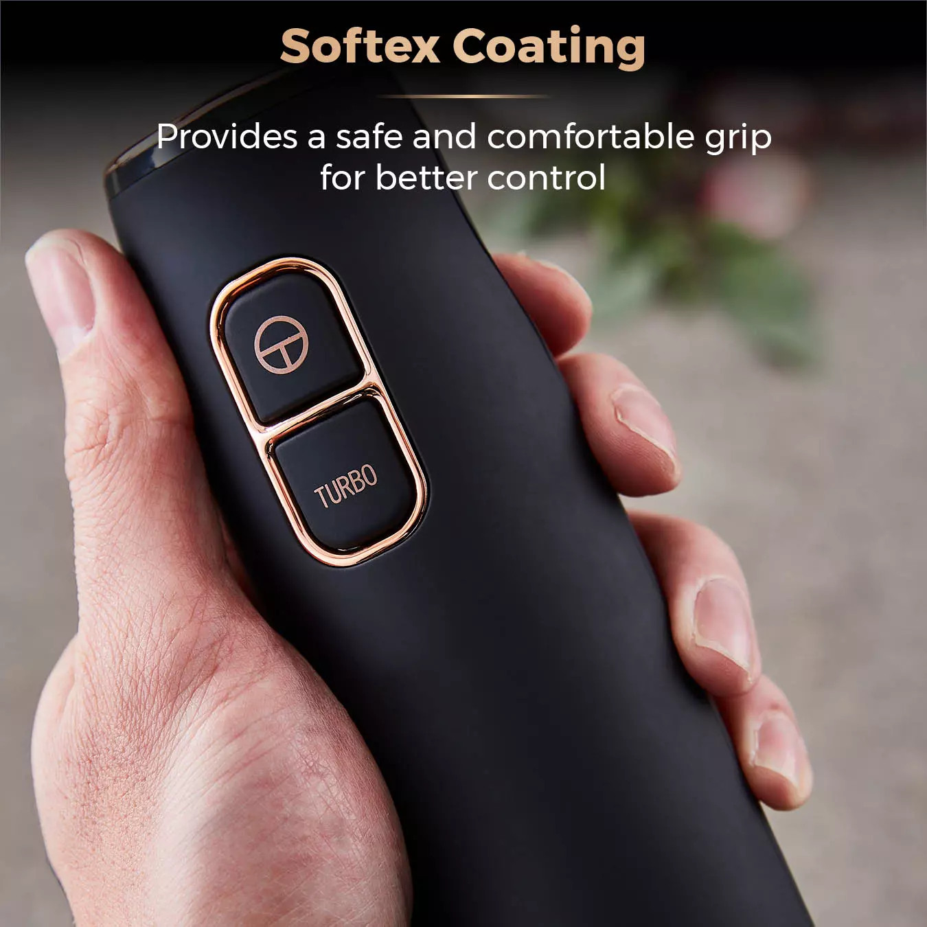 Perfect for a variety of food preparation needs, this Tower Cavaletto stick blender is a great addition to your kitchen collection. Featuring 600W of power, the blades blend through a range of ingredients, including fruit and vegetables, so you can make delicious healthy smoothies or soups. The ultra-long-lasting Durablade stainless steel blades are strong and robust, providing more efficient performance and durability. There are two different speed settings, which includes a turbo function, providing more control and efficient blending. This hand chopper features an ergonomic design with rose gold accents and a Softex coating that gives you added safety and support for comfortable performance.