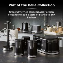 Add some Parisian style to your kitchen with the Tower Belle bread bin. Dressed in a bold colour coating with embossed lettering and chrome highlights, this bread bin boasts an elegant appearance and offers a practical way to store your baked goods. Its large H18.7 x W45.2 x D23.8CM size can hold a variety of loaves, muffins, crumpets and pastries inside, making this an ideal storage solution for a family household.