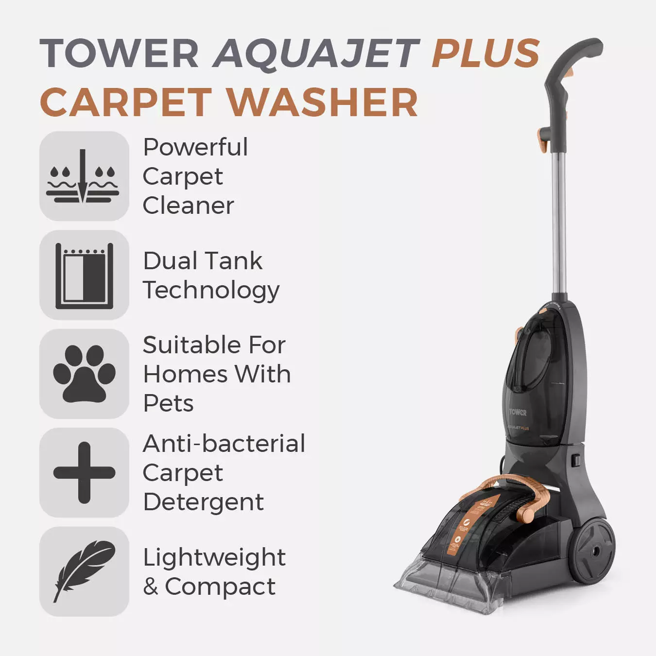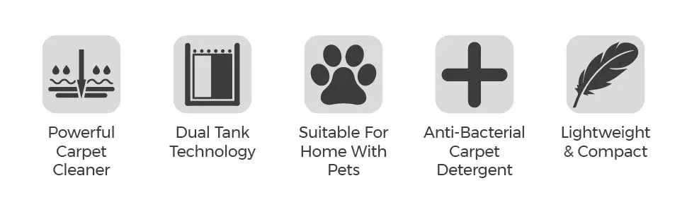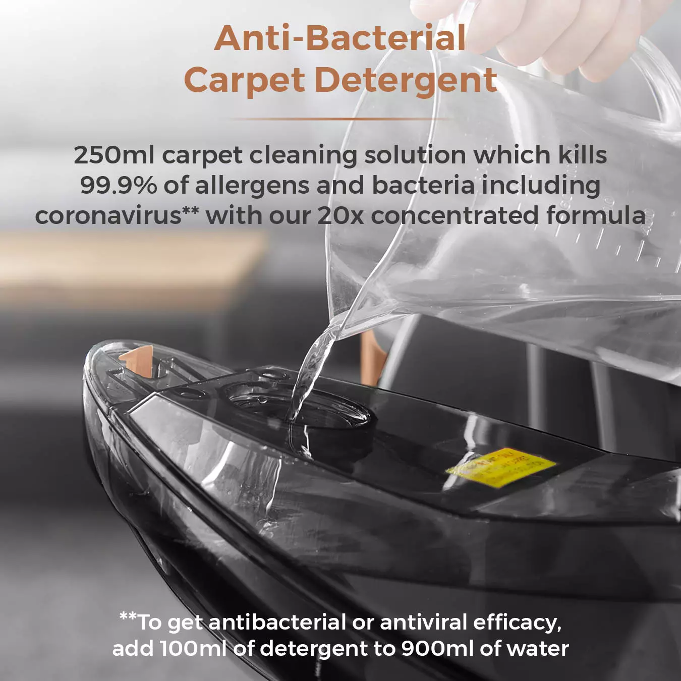 Comes with a free 250ml Tower Carpet Detergent Cleaning Solution, proven to kill 99.9%** of all allergens, bacteria and coronavirus for a deeper all-round clean (**To get antibacterial or antiviral efficacy, add 100ml of detergent to 900ml of water)