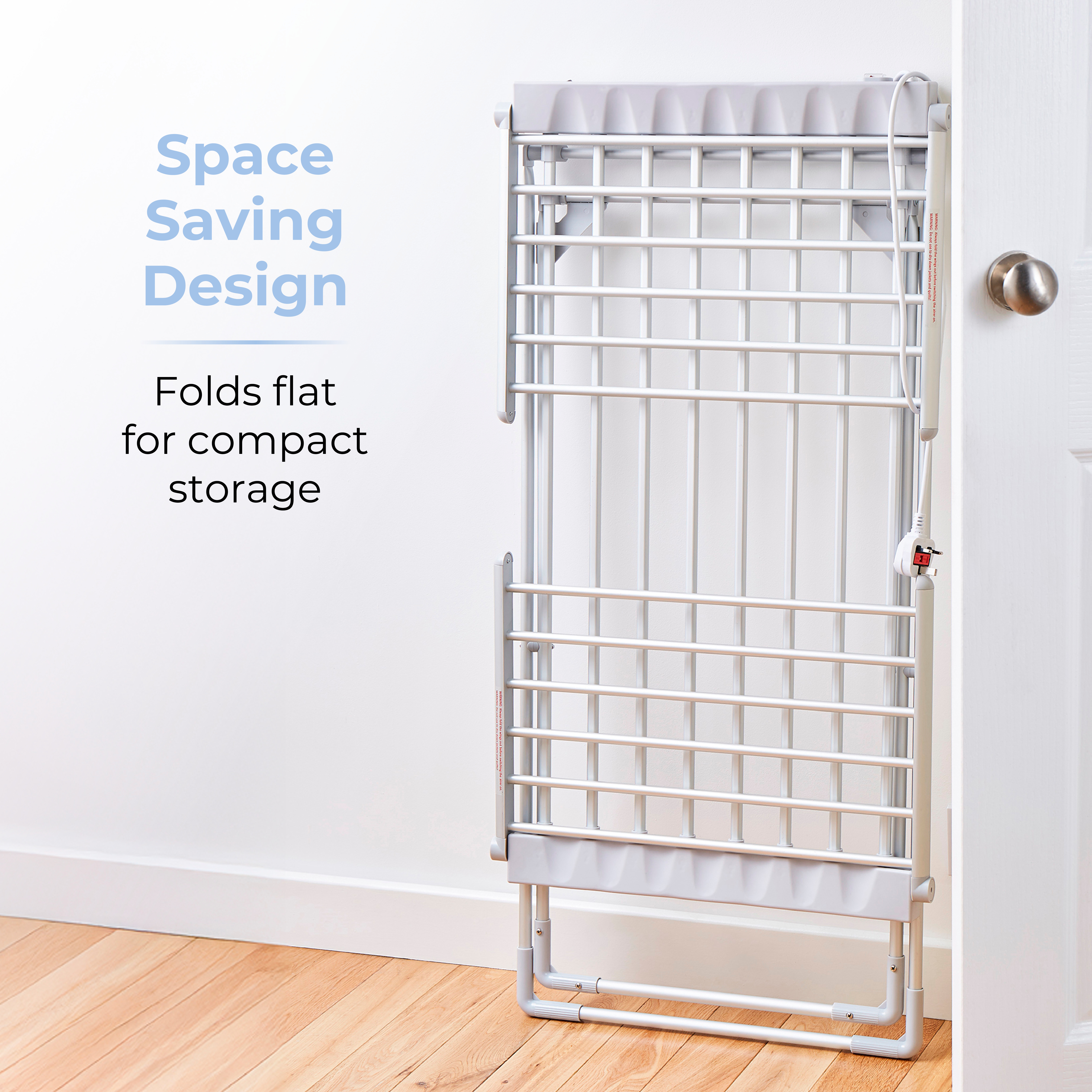 Equipped with 20 evenly heated bars and two fold out wings, its offers a spacious area to dry everything from delicate shirts to bulky bedding all at once. The bars distribute gentle warmth across clothes, speeding up the drying process & preventing damp patches or uneven drying