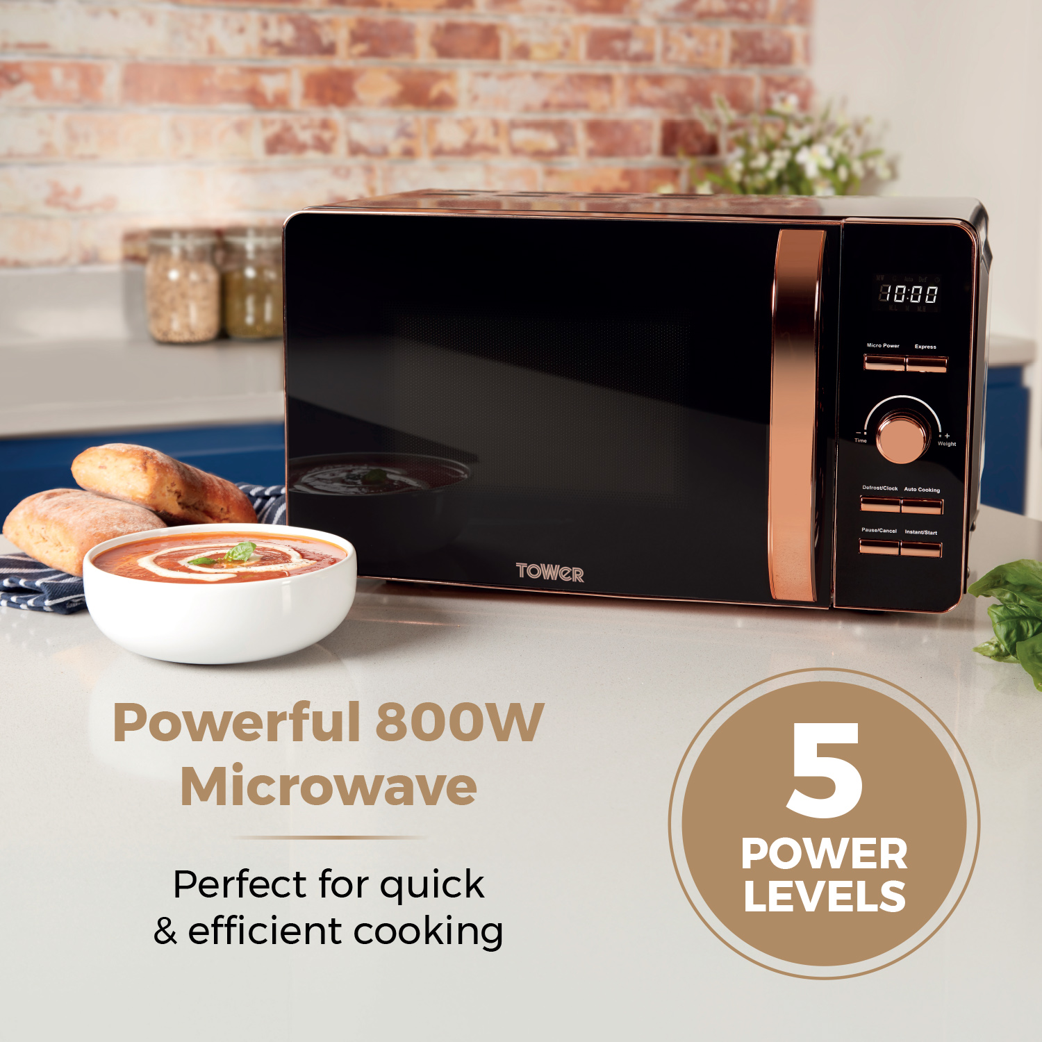 For convenient cooking with added elegance, use Tower’s 800W 20L digital microwave with black & rose gold accents. This trendy microwave is essential for your everyday needs with 8 autocook settings, including milk, rice, auto-reheat & pizzas for your favourite foods at the touch of a button.
