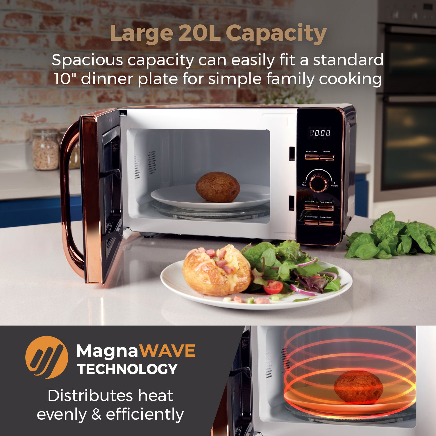 Packed with functionality surrounding elegant rose gold accents, this 800W black 20 litre digital microwave is the perfect appliance for convenient cooking. This trendy microwave is essential for your everyday needs with its 8 autocook settings, including milk/coffee, rice, spaghetti, potatoes, auto-reheat, fish, popcorn and pizzas so you can make your favourite meals at the touch of a button. Featuring 6 power levels, you can adjust to heat up your dinner in a matter of minutes which includes a defrost function, allowing you to cook from frozen and meeting to your busy schedule for quick, easy food. Its huge 20 litre capacity means you can accommodate a standard 10-inch plate without hassle, and with its additional high quality turntable, heat is evenly distributed to ensure your food is cooked thoroughly.