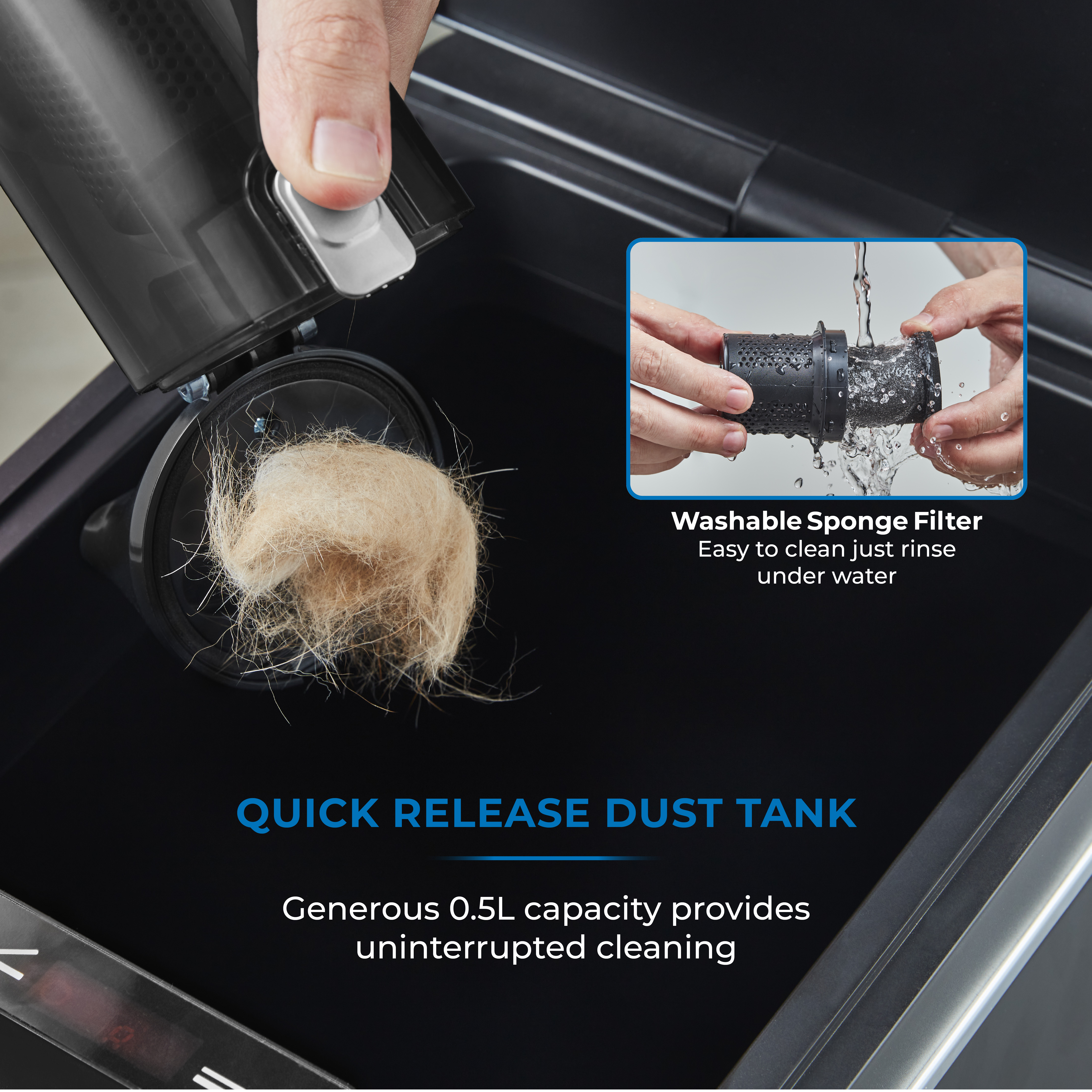 The generous 0.5L dust tank lets you clean uninterrupted, without the need to keep emptying the compartment. The sponge filter is washable and the dust tank has a one-touch emptying feature. It is easily cleaned at the end of your chores, eliminating the need of buying expensive dust bags