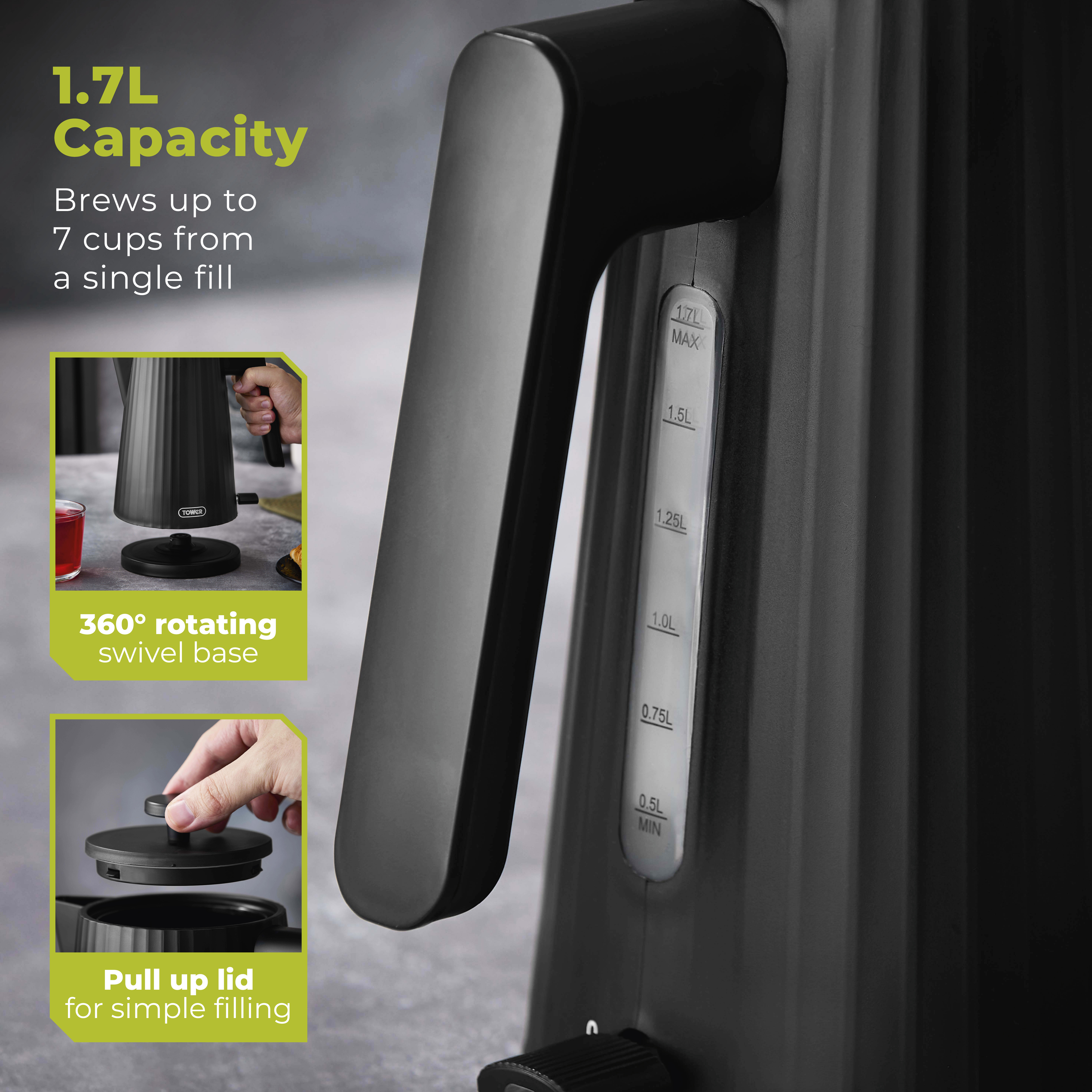 Sustainable and stylish, the Tower ECO 1.7L Kettle is made from 100% recycled plastic with a rapid boil 3KW element for 1 cup in under 45 seconds. It serves up to 7 cups per fill, with a water filter, 360° base, and ribbed design to match the coordinated ECO collection