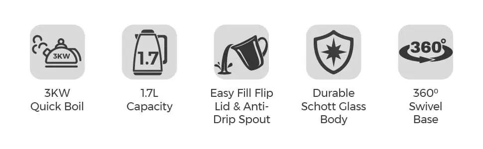 Its stylish Schott glass body illuminates blue to indicate when the kettle is boiling for added convenience. Designed for both left and right handed users, the 360° swivel base makes it comfortable for everyone to make a cuppa, with additional built-in boil dry protection and automatic shut-off for added safety.