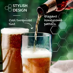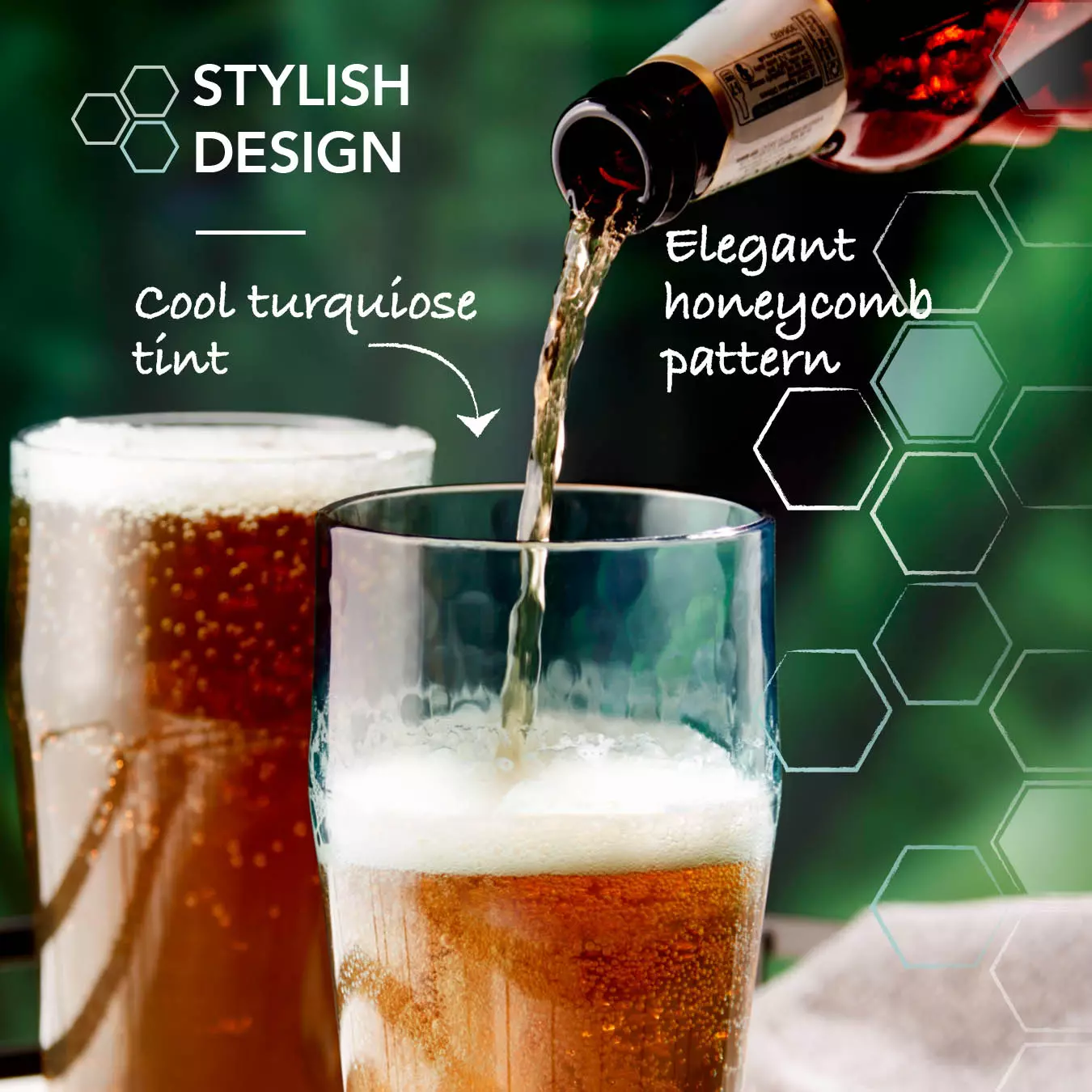 Matching glass set with an elegant honeycomb hexagonal pattern and cool glass-effect turquoise tint to serve your guests in style