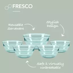 Serve delicious salads, sweet treats and side dishes with this Fresco 5 Piece Serving Bowl Set. It comes with a large 4 litre bowl and 4 x smaller 850ml bowls, perfect for setting the table with tasty meals and snack portions at garden parties and family get-togethers.