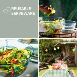 All of the bowls are made from reusable plastic for an eco-friendly alternative to disposable serveware. Designed for families and hectic households, the sturdy plastic material won't shatter when dropped, making them safe for use around children and pets. Lightweight and portable, the bowls are excellent for home use or taking outside to enjoy food in the garden or on a family picnic. Each piece is decorated with an elegant honeycomb hexagonal pattern and cool glass-effect turquoise tint to serve your guests in style.