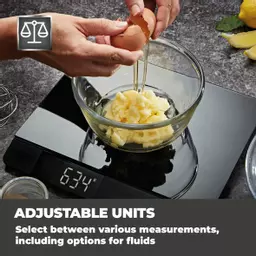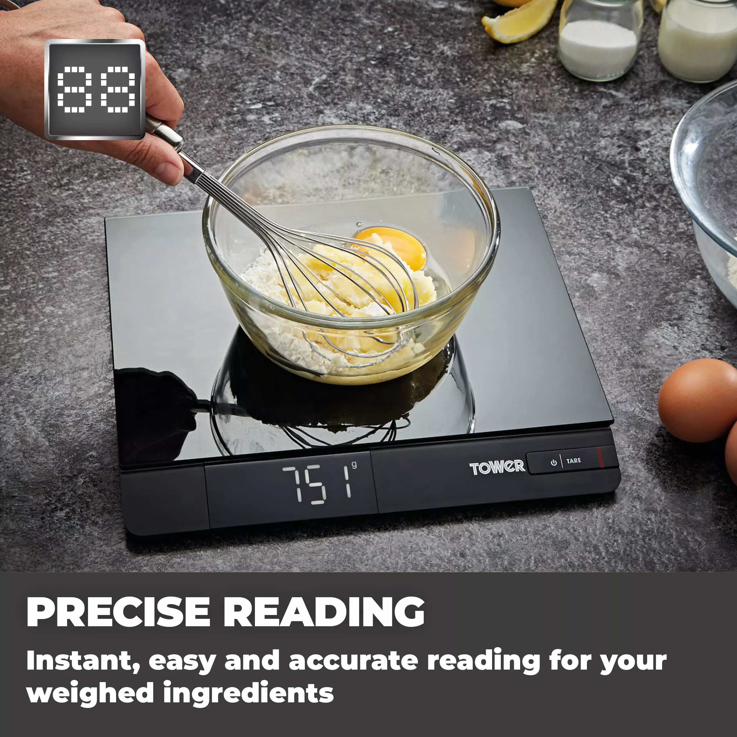 Matching the correct measurements to your cooking recipe is easier than ever with the Tower Precision electronic kitchen scale. Our professionally-designed glass platform scale accurately weighs your ingredients with an instant reading, letting you bake, cook and dish out portions with perfect precision. Its extra-large, easy-to-read screen shows your measurements with adjustable units included for liquids.