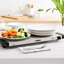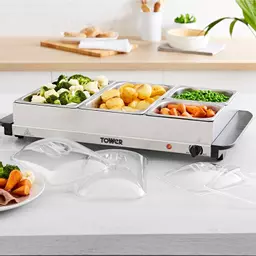 Perfect for those looking to play host, this Tower 4 tray buffet server has everything you need for a successful social gathering. The large trays provide enough space to serve up a range of ingredients, including vegetables, meat, curry and much more. This server also doubles up as a warming plate, so your food is kept at a consistently warm temperature and guests can help themselves throughout the evening. The adjustable thermostat lets you easily change the temperature to ensure all ingredients are cooked at the correct consistency for delicious results. Cool touch handles make it safe and comfortable to serve the food out to your guests.