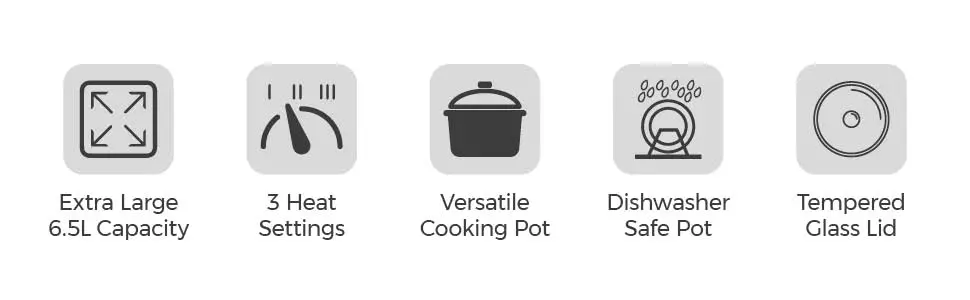 Constructed using stainless steel, this slow cooker is highly durable and long-lasting, while the cool touch handles make for safe and comfortable handling. The toughened glass lid features a hinge lid design for easy opening and serving, while the removable inner cooking pot is dishwasher safe, making it easier to clean up after use.