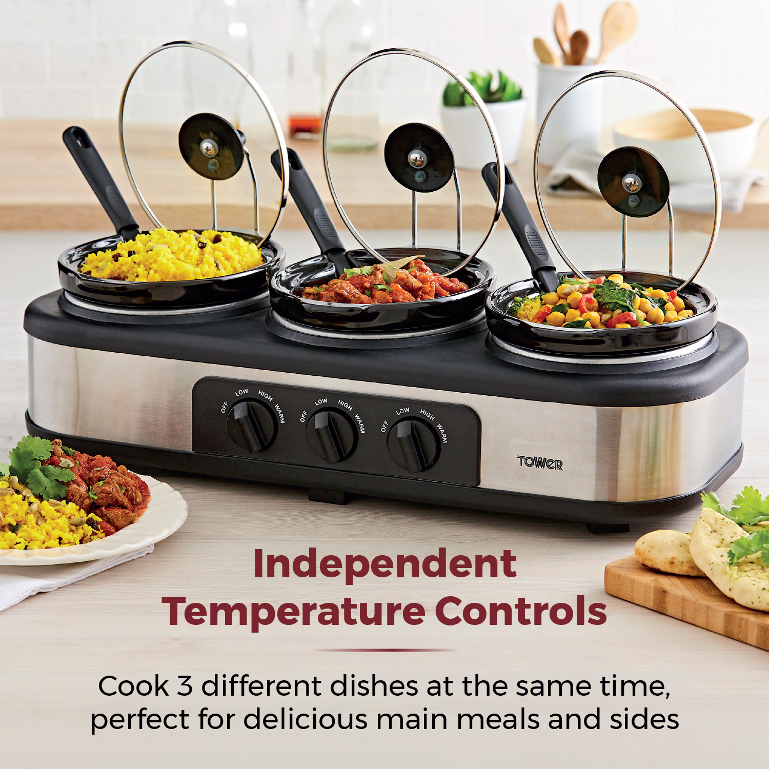 Switch up your mealtimes with the Three Pot Slow Cooker from Tower, which includes three separate cooking pots to cook three different dishes at the same time. Ideal for flavourful curries, mouth-watering casseroles & nutritious vegetables, the pots feature a combined 4.5 litre capacity so you can create plenty of portions for family and guests. Individual temperature controls with 3 heat settings allow you to effortlessly cook a whole host of meals and includes a handy keep warm function, ensuring food stays warm and ready to serve on your schedule. The handy lid rest allows you to store the lids for easy serving. The tempered glass lids help to retain natural moisture and heat whilst serving as a large viewing window to keep an eye on your cooking, with 3 serving spoons that fit perfectly into the spoon rests of each bowl for mess-free serving. The versatile oval cooking pots can be used to cook a wide range of delicious ingredients for the family, designed to cook meat joints, racks of ribs and other irregular shaped foods. The cooking pots can be safely used in the dishwasher and the stainless steel body requires just a simple wipe clean to retain the finish, giving you minimal mess to clear up after dinner’s done.