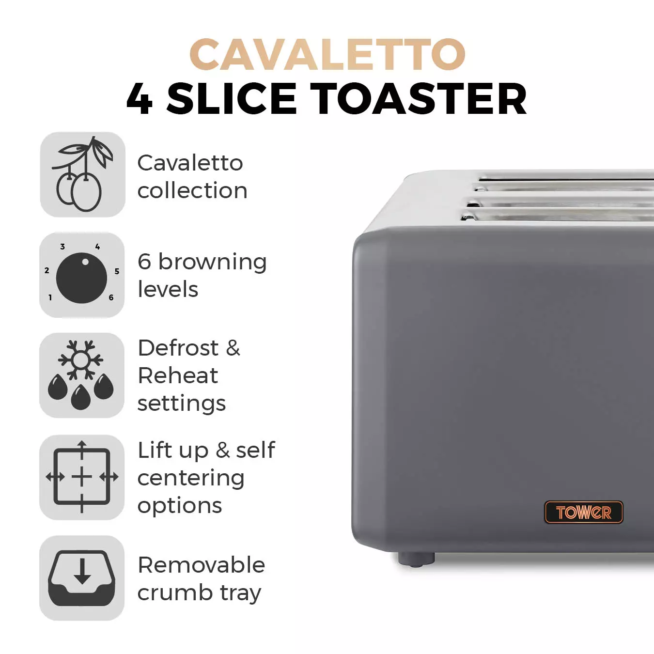 Ultra-modern 4-slice toaster with stylish colours and lustrous rose gold accents adds a touch of elegance to your kitchen. Part of the co-ordinating Cavaletto collection from Tower