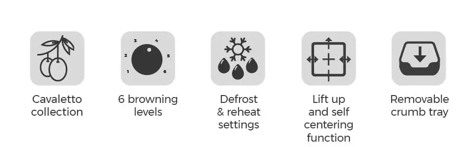 Automatic self-centring guides keep your toast aligned in the middle to ensure even toasting on both sides, while the lift up function makes the toast easier to remove