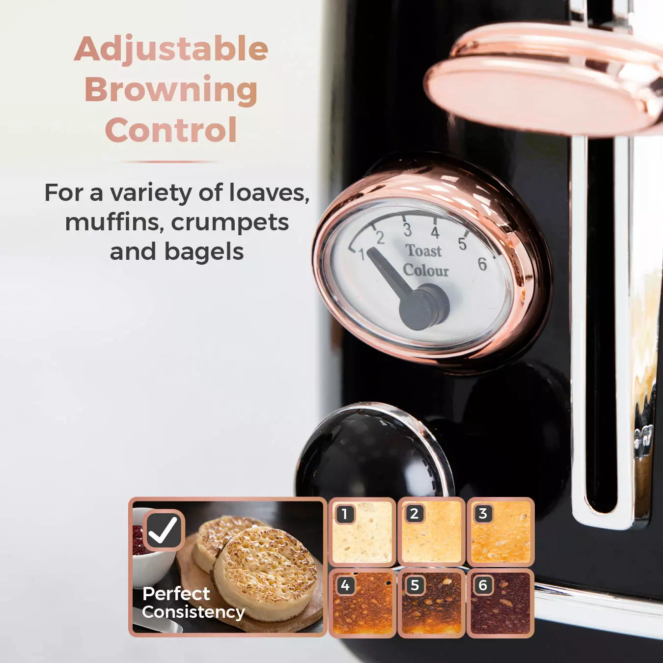 Choose from a range of settings for bread, muffins, crumpets and bagels
