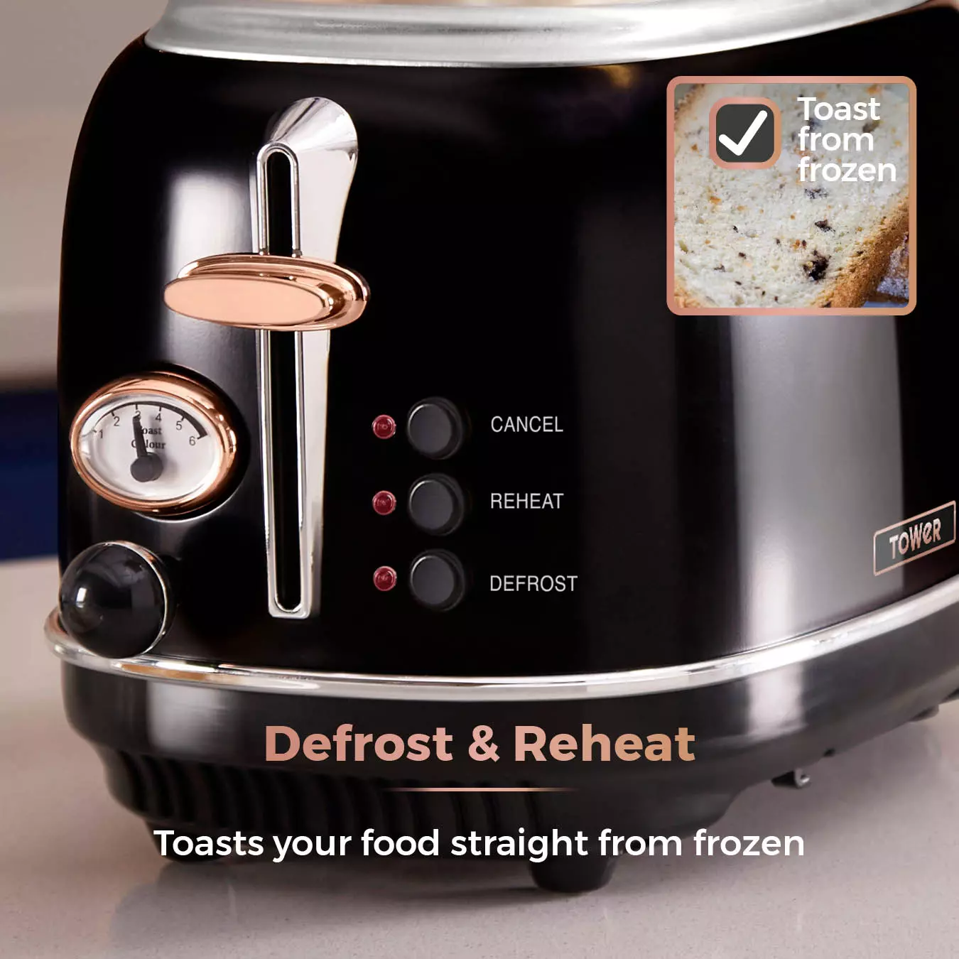 Be a toasting champion with the Tower Bottega rose gold 2 slice toaster. Featuring variable browning control that gives you precise toasting results that suits your taste. From loaves, bagels and crumpets, the self-centring function will consistently toast your items to perfection after every use. For more functionality, the toaster includes a defrost, reheat and cancel options for better control and convenience for toasting frozen snacks.