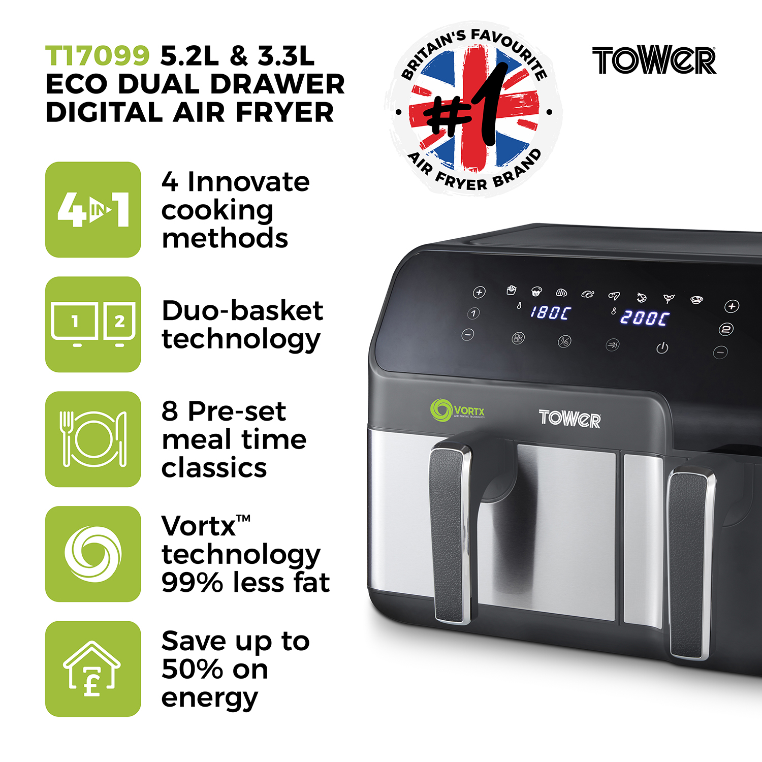 Exclusive to Tower Air Fryers, Vortx technology rapidly circulates hot air around food. Cooking up to 30% faster than a conventional oven and using 99% less oil, allowing you to save up to 70% on your energy. The Two Eco Dual Drawer Air Fryer boasts two different size baskets to provide the ultimate in air frying versatility. Giving you the freedom to cook single portions or larger portions, as required.